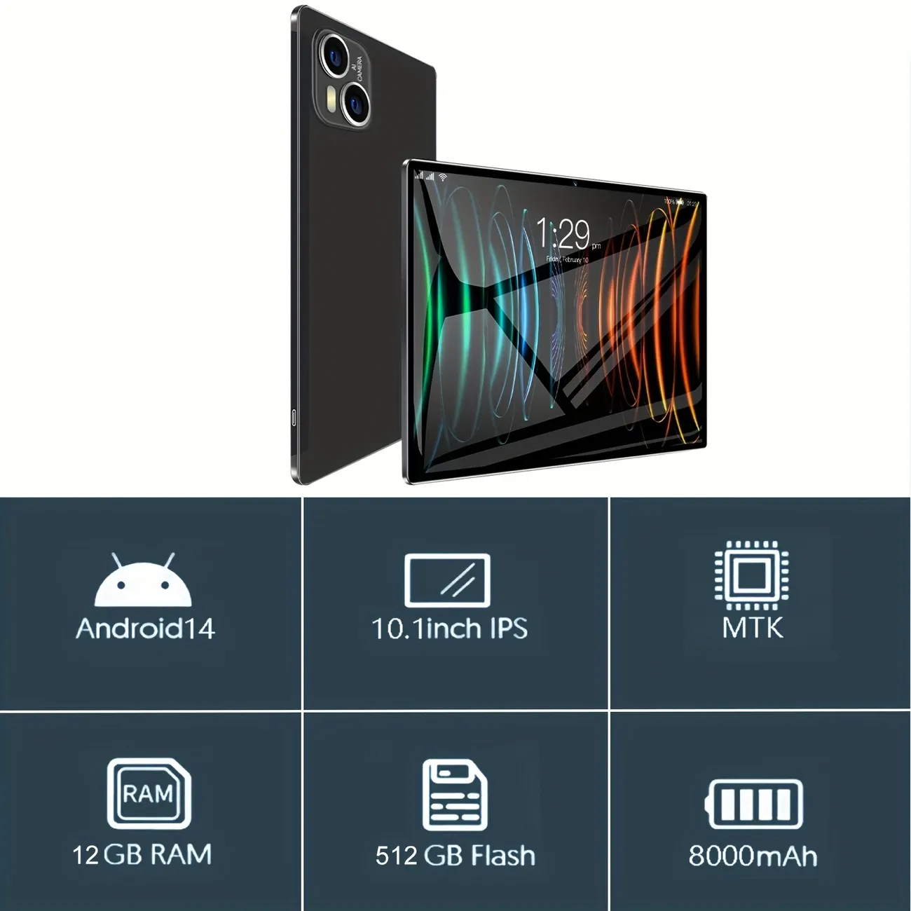 This product features a high-performance MT6750 Octa Core processor and a 10.1 inch IPS display screen with a resolution of 1280*800. It also has 12GB of RAM and 512GB of internal storage, along with dual speakers and dual SIM card/TF card support. Other functions include GPS, FM radio, WiFi, and Bluetooth connectivity. The tablet is equipped with a 2.0MP front camera and a 5.0MP rear camera, and supports multiple languages with the Android 8 operating system. It is powered by a 10000mAh lithium-ion battery.