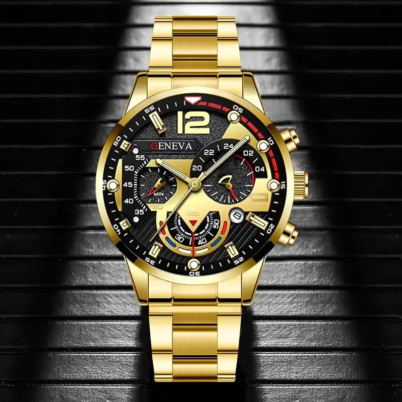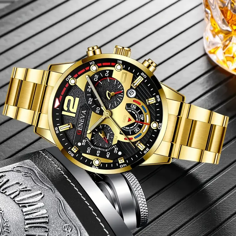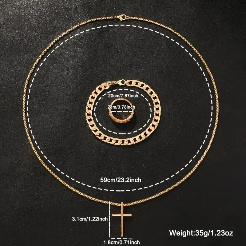 🎁4-Piece Gift Set Casual Gold-Tone Watch + Cross Pendant + Stackable Jewelry | Ultimate Stylish Combo for Him ⌚✨⛓️