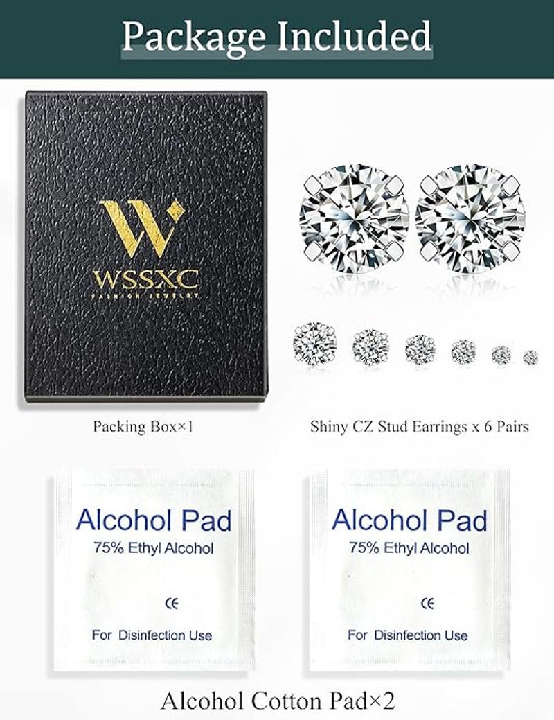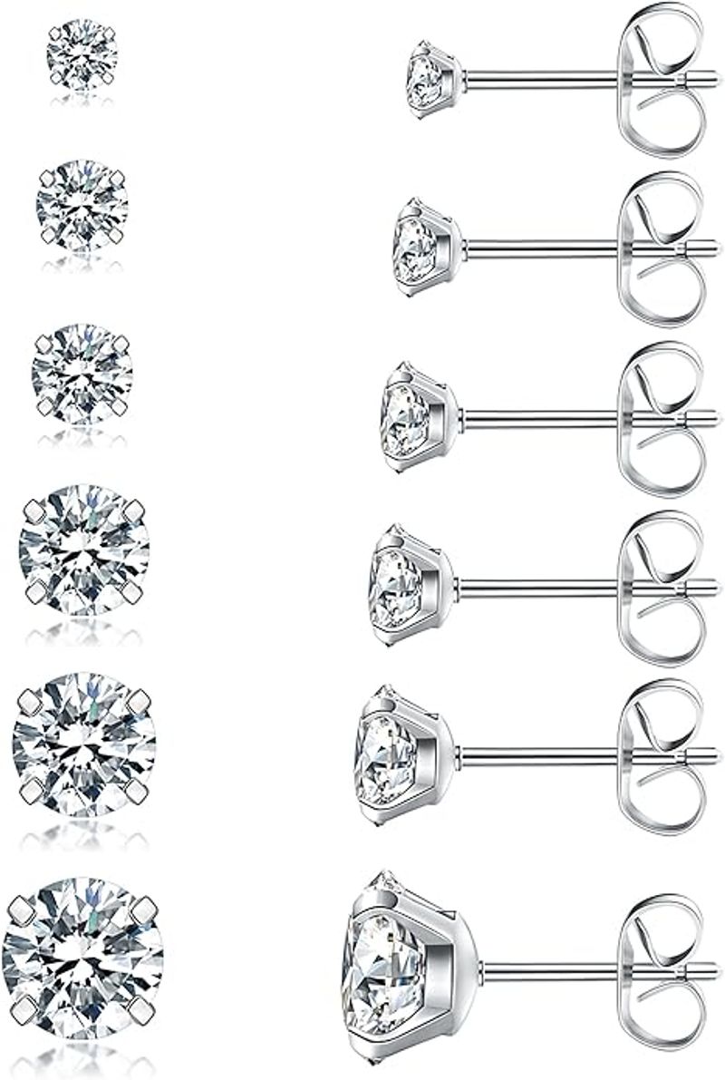 6 Pairs Stud Earrings Set, Hypoallergenic Cubic Zirconia 316L Earrings Stainless Steel CZ Earrings 3-8mm (Steel color)