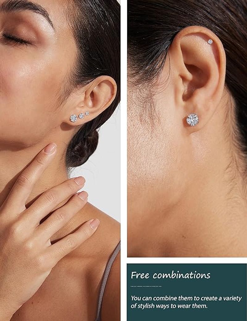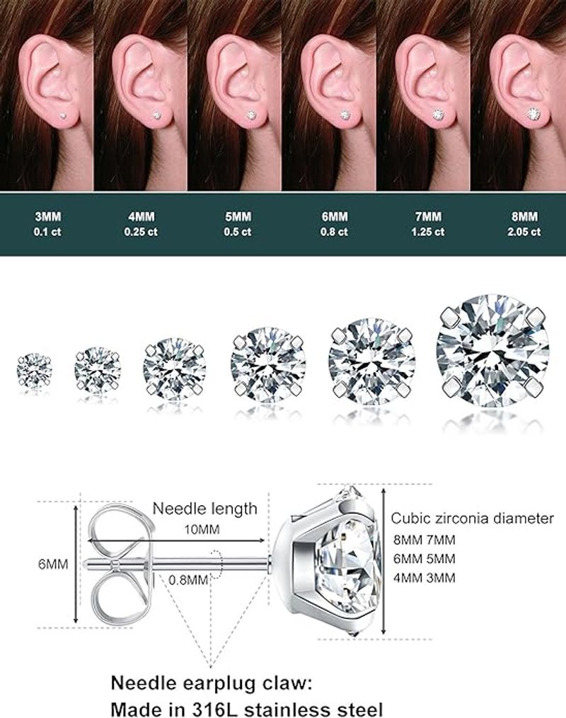 SET OF 6 PAIRS - Package includes 6 pairs of stud earrings in 6 sizes, 3mm/4mm/5mm/6mm/7mm/8mm. Gauge Size: 20G =0.8mm, pin size: 10 mm. The butterfly buckle add extra protection for you.