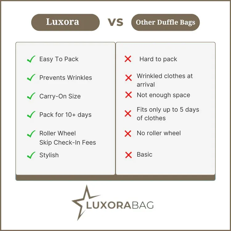 Say goodbye to your suitcase. The Luxora Travel Bag's foldable design allows you to fit 3x the clothes/accessories in the same amount of space. No more waiting in line to check your suitcase in and save $$$ on checked bag fees!
